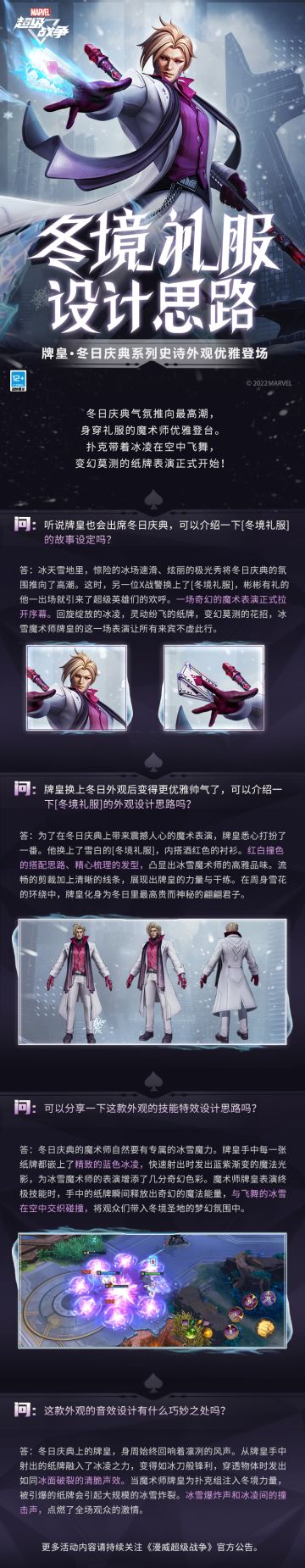 { "text": "#漫威超级战争##牌皇# \n凛冬已至,为了在盛大的冬日庆典上展露身手,\n魔术师牌皇换上了应景的雪白绅士礼服,\n酒红色的衬衫更增添了一分神秘气质。\n当牌面刻上冰雪,魔术也成为了冬日的奇幻限定。\n“节日快乐!”\n\n全新史诗外观【牌皇·[冬日庆典系列]冬境礼服】即将在1月5日零点上线,上架首周享受8折优惠,最低仅需710星际币~", "raw_text": "" }