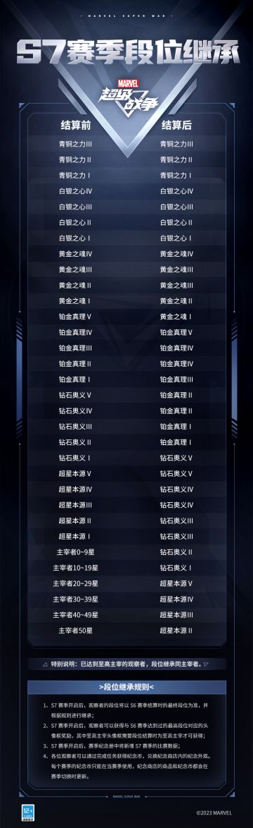 { "text": "#漫威超级战争##漫威超级战争S7赛季#\n全新S7赛季将于1月12日正式开启,还没有到达理想段位的观察者们快抓住赛季末的小尾巴,积极冲分吧!在此,薇薇安为各位带来了段位继承规则,同时特别提醒大家留意:\n\n1、S7赛季开启后,观察者的段位将以S6赛季结算时的最终段位为准,并根据规则进行继承(继承规则见下图);\n2、S7赛季开启后,观察者可以获得与S6赛季达到过的最高段位对应的头像框奖励和水晶奖励,其中至高主宰的段位奖励需要段位结算时为至高主宰才可获得,如果历史最高段位是至高主宰但段位结算时没达到,将会获得主宰者的对应段位奖励;\n3、S7赛季开启后,赛季纪念册中将新增S7赛季的比赛数据;\n4、各位观察者可以通过完成任务获得纪念币,兑换纪念商店内的纪念外观。每个赛季的纪念币只能在当赛季使用,纪念商店的商品和纪念币都会在赛季切换时更新。\n\n更多S7新春版本内容敬请留意《漫威超级战争》官方动态。", "raw_text": "" }
