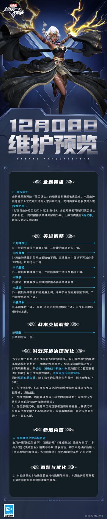 { "text": "#漫威超级战争##维护预览# \n观察者们下午好,本周的维护预览来啦!\n▷全新辅助型英雄「黑舌谋士」即将登陆瓦坎达战场!\n▷星际展馆兑换商城更新,限定外观惊喜返场!\n▷针对刀锋战士、松鼠女、卡魔拉、铁拳、战虎、暴风女进行平衡性调整。\n▷优化游戏环境治理,新增系统违规行为判定。\n\n更多详情快戳大图了解吧~", "raw_text": "" }