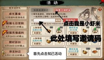 游戏右上角点开活动,寻觅知己,然后点开我是小虾米,输入邀请码