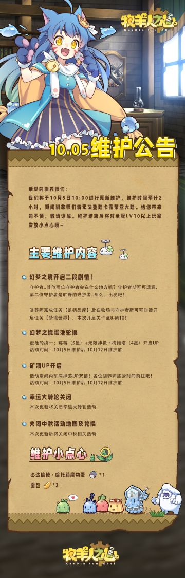 10月5日更新公告 亲爱的驯养师们: 我们将于10月5日10:00进行更新维护,维护时间预计2小时, 期间驯养师们将无法登陆卡露蒂亚大陆。 本次更新需要重新下载游戏客户端,建议驯养师卸载后重新安装客户端。 给您带来的不便,敬请谅解。