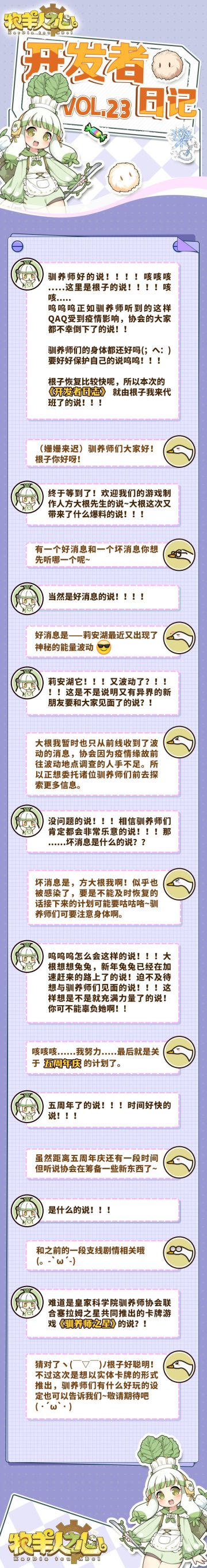 { "text": "「开发者日志第二十三期」 \n大半年不见的栏目终于来了喵!\n代班主持大根子&制作人方大根\n“double根”组合会带来什么精彩消息喵!\n--------------------------------------------\nMIO温馨提示:春节来临,疫情当前。驯养师一定要照顾好自己与家人喵~", "raw_text": "" }