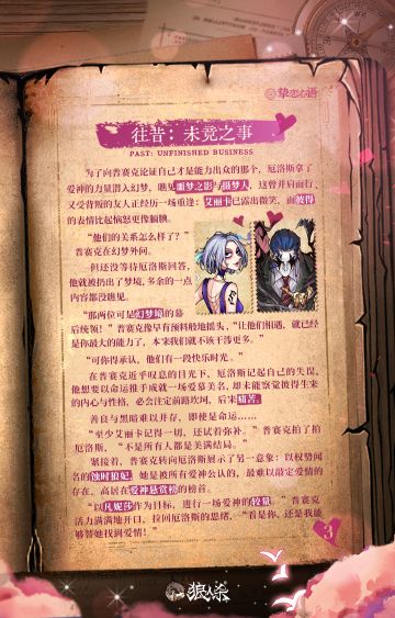 { "text": "【520限定六星皮肤故事—挚恋心语】\n\n第三章 | 往事:未竟之事\n\n善良与黑暗难以并存,即使是命运......未能分出高下的祂们,将目光转向了“爱神悬赏榜”榜首!“以凡妮莎作为目标,一场爱神的较量。”再次开启~", "raw_text": "" }