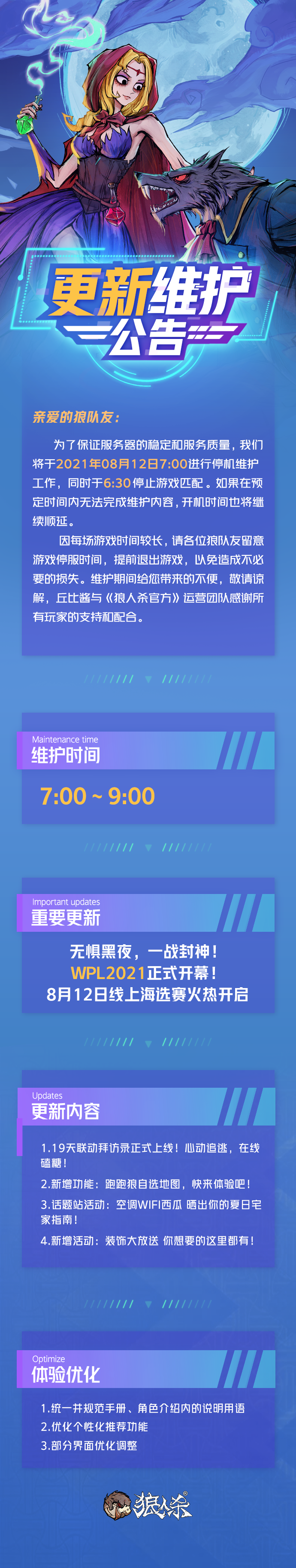 { "text": "【8月12日 狼人杀更新维护公告】\n\n无惧黑夜、一战封神!WPL2021正式开幕!\n\n8月12日线上海选赛火热开启哦~", "raw_text": "" }