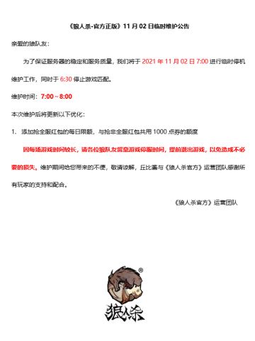 【11月2日 狼人杀官方临时更新维护公告】