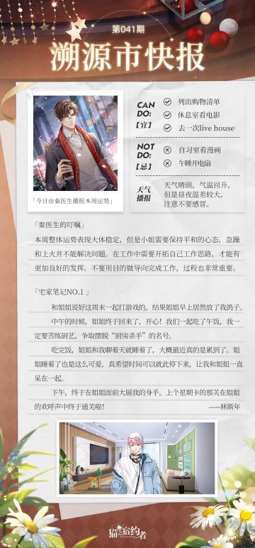 { "text": "今日报讯:\n今日由秦医生播报本周运势\n林老板的宅家笔记一条\n\n今日话题:\n探长大人们周末一般会怎样度过呢?\n欢迎在评论区留下你的答案。", "raw_text": "" }
