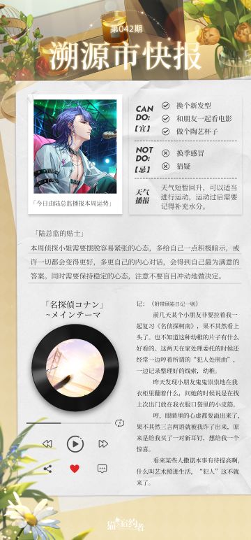 { "text": "今日报讯:\n今日由陆总监播报本周运势\n猫猫留声机今日推歌附带顾崧日记一则\n\n\n今日话题:\n探长大人们生活中有收到过什么小惊喜嘛?\n欢迎在评论区留下你的答案。", "raw_text": "" }