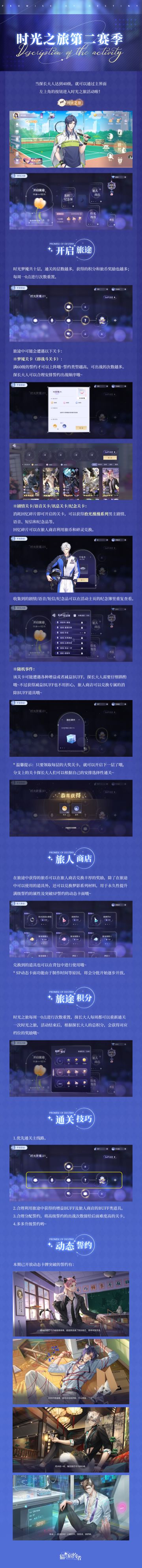 { "text": "时光之旅第二期来袭!\n活动时间:11月8日11点—12月11日24点\n※剧情关卡/语音关卡/讯息关卡/纪念关卡内容更新\n获得方式:消耗回忆碎片即可开启的关卡,可以获得拾光漫漫系列男主剧情、语音、短信和纪念品等。\n回忆碎片可以在旅人商店利用旅币和碎灵兑换。\n\n※动态誓约更新\n本期已开放动态卡牌突破的誓约有:林斯年SP誓约【夕年晴光】;陆瑀SP誓约【易感期】;顾崧SP誓约【过度服务】;秦淮SP誓约【共与沉沦】。\n\n↓ 戳下方长图查看详细介绍 ↓", "raw_text": "" }