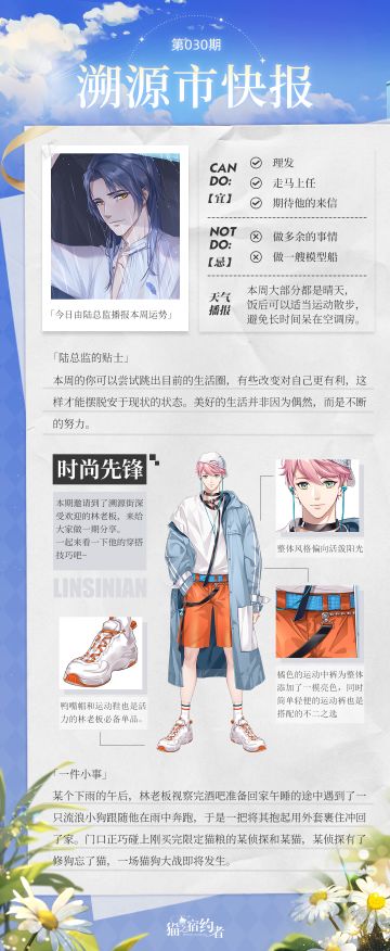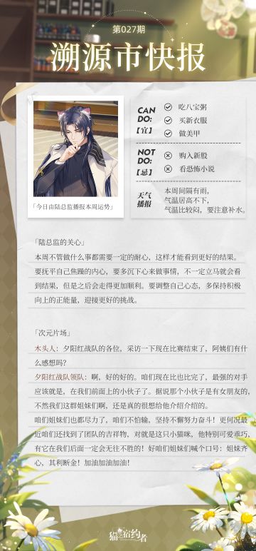 { "text": "今日报讯:\n今日由陆总监播报本周运势\n次元片场参访夕阳红战队成员\n\n今日话题:\n探长大人们心中的理想小猫咪是什么样子的呢?\n欢迎在评论区留下你的看法~\n", "raw_text": "" }