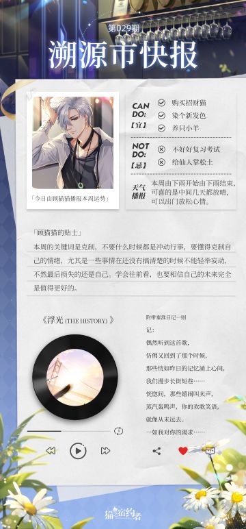 { "text": "今日报讯:\n今日由顾猫猫播报本周运势\n今日推歌:浮光 (The History) 附带秦淮日记一则\n\n今日话题:\n探长大人们家中有养小动物嘛,都是什么呢?\n欢迎在评论区留下你的看法~", "raw_text": "" }
