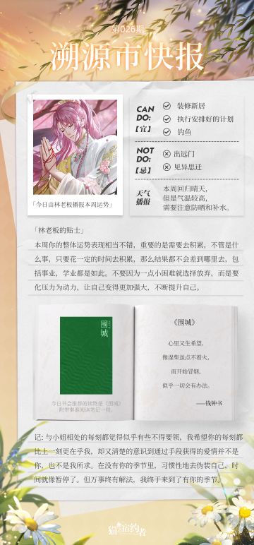 { "text": "今日报讯:\n今日由林老板播报本周运势\n今日书会推荐的读物是《围城》附带秦淮阅读笔记一则。\n\n今日话题:\n探长大人们有安排自己的夏日旅行计划吗?\n欢迎在评论区留下你的看法~", "raw_text": "" }
