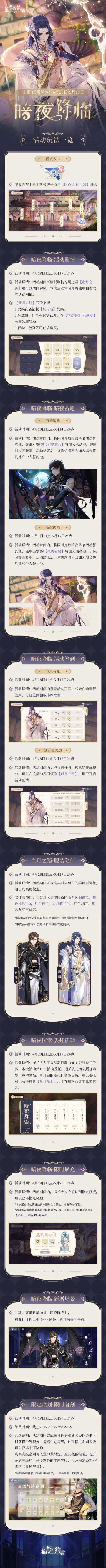 { "text": "暗夜降临系列丨沉溺深渊活动内容预告\n\n【暗夜降临·活动剧情】\n活动时间:4月28日11点-5月17日24点\n活动详情:活动期间可消耗剧情专属道具【逝月之钥】进行剧情的解锁,本次活动暂时开放陆瑀和秦淮的活动剧情。\n\n【活动签到】\n{1.登录有礼}\n活动时间:4月28日11点-5月17日24点\n活动详情:活动期间内登录活动页面,将会自动进行签到,每日签到领取丰厚福利。\n{2.活跃度奖励}\n活动时间:4月28日11点-5月17日24点\n活动详情:活动期间内完成每日任务,积累活跃度积分,可以在该活动界面领取【逝月之钥】,用于开启活动剧情。\n\n【兑换商店】\n活动时间:4月28日11点-5月17日24点\n活动详情:在兑换商店可以消耗【星月瓶】,兑换开启活动剧情专属道具【逝月之钥】和场景合成专属材料,以及月丘石等其他材料。\n\n【血月之镜·服装陪伴】\n活动时间:4月28日11点-5月17日24点\n活动详情:活动期间可以购买对应男主的陪伴服饰包,组合购买更优惠。\n\n【活动卡池:暗夜降临】\n活动时间:4月28日11点-5月14日24点\n活动详情:活动时间内,将限时开放暗夜降临活动誓约池,秦淮SP誓约【狩猎游戏】将加入活动池,并限时提高概率,活动结束后,该誓约将不会加入综合誓约池和个人誓约池。\n*秦淮SP誓约【狩猎游戏】为语音卡。\n\n【活动卡池:暗夜降临】\n活动时间:5月1日11点-5月17日24点\n活动详情:活动时间内,将限时开放暗夜降临活动誓约池,陆瑀SP誓约【夜烬破晓】将加入活动池,并限时提高概率,活动结束后,该誓约将不会加入综合誓约池和个人誓约池。\n*陆瑀SP誓约【夜烬破晓】为语音卡。\n\n【限时累充】\n活动时间:4月28日11点-6月21日24点\n活动详情:活动期间内,探长大人充值达到指定额度,可以获得指定奖励。\n*本次累充活动将延续到林斯年生日活动、暗夜降临·下篇。\n*达到指定额度将获得暗夜降临周边礼包,请加入用户群联系管理员【木头人】进行奖励的领取。\n\n【限定企划复刻】\n活动时间:4月28日11点-5月20日24点\n活动期间完成每日任务和通关委托关卡可以获得企划积分,提升企划等级,达到指定企划等级可以获得丰厚奖励\n购买高级企划可以立即获得提升至25级的经验,提升企划等级还可获得额外的丰厚奖励,以及限定顾崧SP誓约【夏风与诗】\n*奖励领取时间截止5月22日24:00\n\n欢迎加入官方Q群:281184498\n", "raw_text": "" }