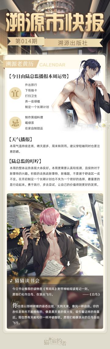{ "text": "叮~盼望着,盼望着,林老板带着他的书单走来啦!\n\n今日报讯:\n今日由陆总监播报本周运势\n林老板提供书单和读书笔记一份\n\n今日话题:\n探长大人在休息的时候都喜欢看什么书籍呢~\n欢迎在评论区留下你的看法~\n", "raw_text": "" }