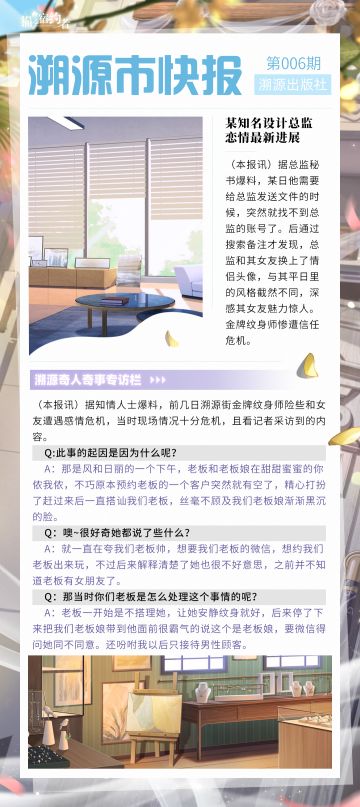 { "text": "溯源市快报今天正式开刊啦!即日起每周一,周五诚邀探长大人们一起来看!\n今日报讯:\n某著名珠宝企业大头旗下某位设计总监近日一反常态连续几日都踩点下班后过段时间又回到公司继续加班,连日上演护花使者为哪般?\n溯源市纹身圣地老板兼金牌纹身师沉迷抽卡游戏无心工作致营业额下降其原因又是为何?\n且看本报记者木头人发回的报道。\n\n探长大人们心中最喜欢的的卡牌是哪一张呢?\n欢迎在评论区留下你的看法~", "raw_text": "" }