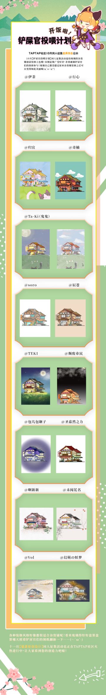 "text": "10月TAPTAP【铲屎官投喂计划】同人征集活动,琉璃邀请了铲屎官们来给杂货铺创意装修上色哦喵!本期征集可是受到了铲屎官们的热烈欢迎,社区惊现超多精美华丽杂货铺小房子!琉璃照例做了个集锦,大家一起来康康美丽杂货铺呀喵!\n\n11月TAPTAP同人征集【猫蛋原创设计活动】正在火热进行中哦,参与活动征集自由设计个性猫蛋get每月同人猫玉大奖吧!\n\n活动帖传送门>>>>https://www.taptap.com/topic/19571530",