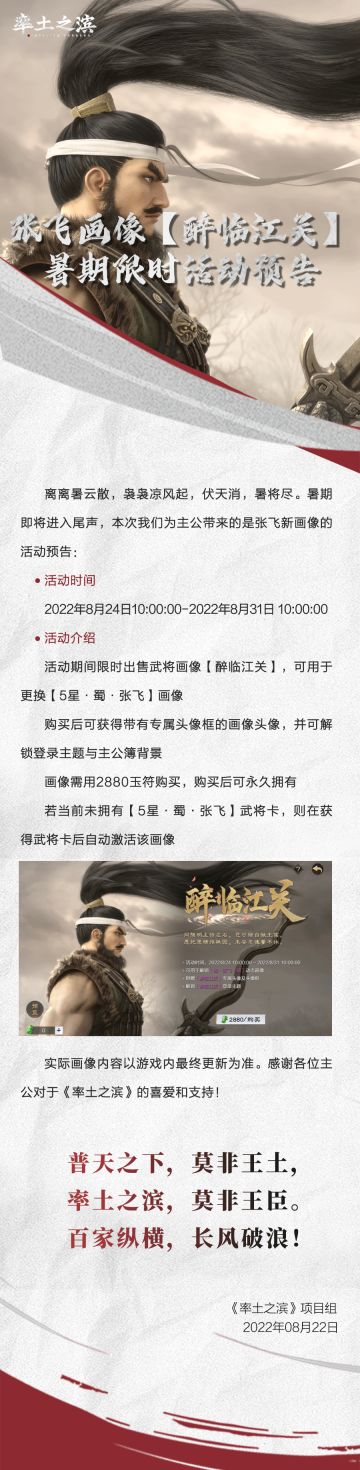《率土之滨》张飞画像【醉临江关】暑期限时活动预告