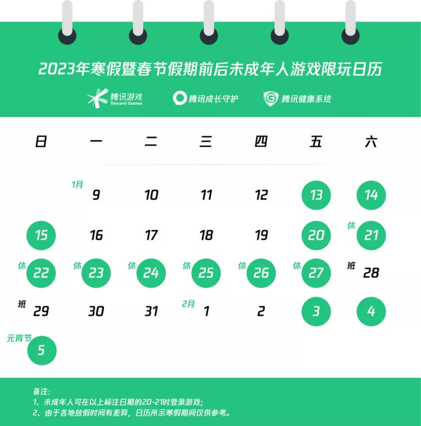 腾讯发布寒假限玩日历,未成年人寒假期间可玩14个小时