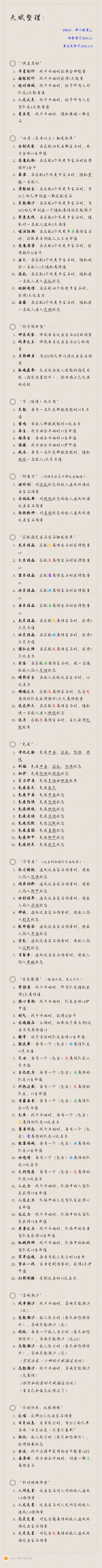 { "text": "整理了一下截止目前(2023.2.14)为止游戏里卡牌出现的天赋(如下图):\n\n初衷 是为了方便玩家(特别是萌新)对天赋整体有个大概的了解和把控\n方便自己配队。\n\n\n然后是一些小想法:\n可见游戏内卡牌的天赋是有一定框架在的\n所以一些热心玩家(比如我)\n在自己构想的时候就\n不要那么 天马行空😁\n还是按照这个框架来补充和发散叭\n\n另外,很期待能看到更多更新的配队阵容出现,而不是千篇一律。\n虽然这对于现如今卡牌数量还不多的情况来说。比较困难,但总还是有的呗。\n\n欢迎且期待交流", "raw_text": "" }