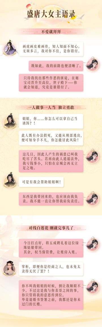 { "text": "这两天,很多糖宝分享了喜爱的女主标准:\n知性、冷静、有主见、勇敢潇洒、独立成熟、智商在线、可盐可甜……\n\n这么一品,折枝觉得咱们盛唐的大女主一定会很受大家喜爱哒!\n不如我先带各位糖宝看看咱们盛唐烟雨-万宝阁掌柜的聊天画风吧——", "raw_text": "" }