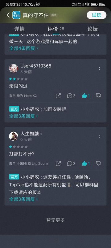{ "text": "关于闪退问题再再再说明,官方也有说明提示\n目前也提交审核,通过了就可下载本地愉快的玩耍了,当然你也可以加群交流下载\n会同步更新的!感谢您的理解", "raw_text": "" }