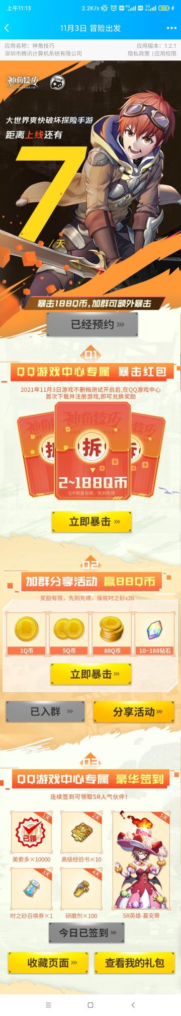 [神角技巧手游]手Q中心新活动!七天倒计时!签到5天送SR基安蒂