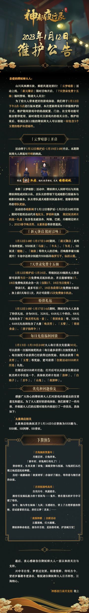 { "text": "#神都夜行录# #卯兔老板新店开业##更新公告#\n亲爱的降妖师大人:\n山川风来拂长袂,乘槎共逐沧溟归!「云梦暗影」活动上线,「新元肇启」限时召唤开启,「7天登录免费十五抽」福利登场,敬请大人关注!\n为了给大人带来更好的游戏体验,我们将于1月12日下午2点-5点进行版本更新,本次更新将采用不停服维护的方式,维护期间游戏中的助战配置、门会、社交等功能可能会暂停使用,届时请您关注游戏内的相关公告。维护结束后,等级达到12级的降妖师大人可以领取一封包含3个玉璧的维护补偿邮件。\n\n——下期预告——\n\n「吉兔驰跃贺嘉年」\n月德呈祥,白兔祥来。\n「新年好,卯兔商行有礼了!」\n癸卯将至,生肖灵兽「卯兔」满载货物与祝福,与兔团们从巴蜀之地迢迢赶赴神都。\n历经一载磨砺的「斑寅将军」亦备好了擂台,等待着与继任者的会面。\n\n「吉羽祝瑞鸣高冈 」\n吉光归兮,凤递韶音。\n拥有引发祸乱能力的十首妖鸟——鬼车,曾在漫长的岁月中习惯了等待。\n如今,她与孪生妹妹「九凤」互感相生,穿上了古楚厚重的祭袍,尝试着掌控吉运,担任云梦「灵巫」……\n\n「夜探神都 」全新活动\n云暮渐晚,灯火璀璨。\n降妖师奉命夜巡,探市井百相,觅街巷奇闻,护洛城万安。\n\n最后,衷心感谢各位降妖师大人一直以来的关注与支持。\n兴中寻白雪,梦里过沧溟。相逢惜醉,何叹古今,望君岁暮隆冬更添衣,敬祝诸位降妖师大人日月杯饮,江海纳心。\n\n神都夜行录开发组 敬上", "raw_text": "" }