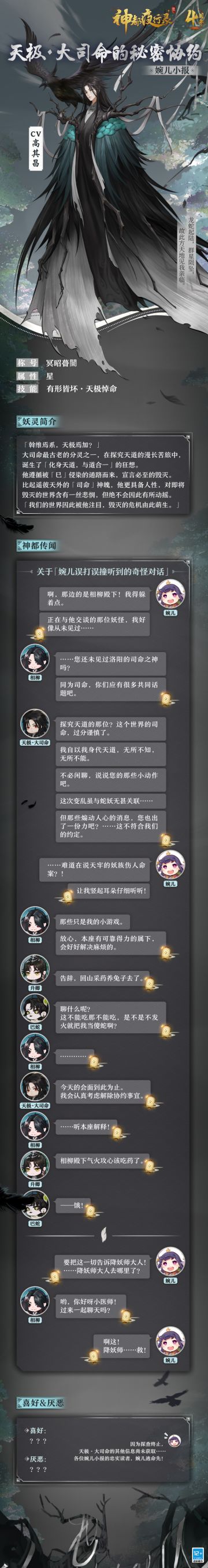 { "text": "#神都夜行录# #神都四周年庆典# #新妖灵情报#\n斡维焉系,天极焉加?\n婉儿偷偷瞧见相柳殿下在同一个从未见过的妖怪交谈,似乎是在说天牢的妖族伤人命案?!降妖师大人,快来查收婉儿的最新情报哇!!\n全新特典SSR妖灵「天极·大司命」将于9月29日上线,各位大人快来通过婉儿小报抢先了解吧~", "raw_text": "" }