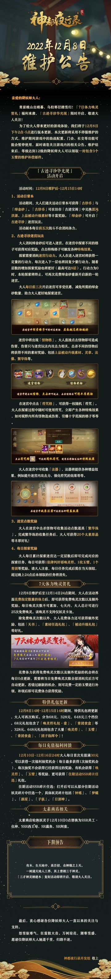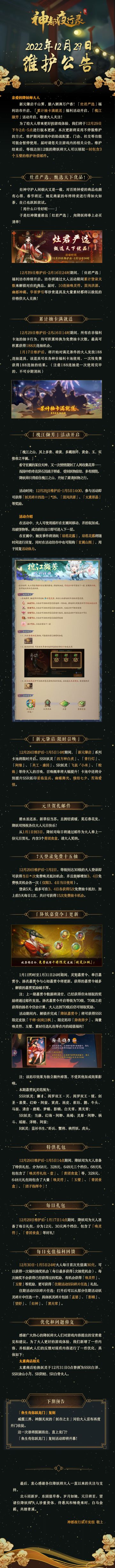 { "text": "#神都夜行录##更新公告#\n亲爱的降妖师大人:\n新元肇启千山霁,腊八粥沸万户香!「灶君严选」福利坊市开启,「累计抽卡满就送」福利活动开启,「槐江撷芳」活动开启,敬请大人关注!\n为了给大人带来更好的游戏体验,我们将于12月29日下午2点-5点进行版本更新,本次更新将采用不停服维护的方式,维护期间游戏中的助战配置、门会、社交等功能可能会暂停使用,届时请您关注游戏内的相关公告。维护结束后,等级达到12级的降妖师大人可以领取一封包含3个玉璧的维护补偿邮件。\n\n——下期预告——\n\n「鱼生有你跃龙门」复刻\n威震三界,神颜无双的「妖市之主」河伯大人宣布再度开门收徒。\n这一次谁将脱颖而出,直上龙门?\n「鱼生有你跃龙门」复刻活动即将开幕!\n\n\n最后,衷心感谢各位降妖师大人一直以来的关注与支持。\n北斗回新岁,东园值早春。岁月如驰,元旦将至,望诸位降妖师大人珍重贵体,待惠风和畅春来时,白马金羁,共踏青溪。\n\n\n神都夜行录开发组 敬上", "raw_text": "" }