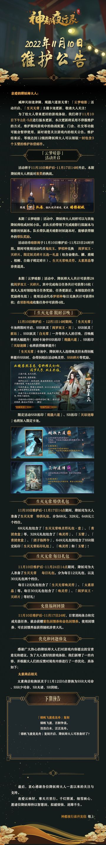 { "text": "#神都夜行录##更新公告#\n亲爱的降妖师大人:\n威神灭却迷津障,观摄六道皆无常!「云梦暗影」活动开启、「生灭无常」主题卡池更新,敬请大人关注!\n为了给大人带来更好的游戏体验,我们将于11月10日下午2点-5点进行版本更新,本次更新将采用不停服维护的方式,维护期间游戏中的助战配置、门会、社交等功能可能会暂停使用,届时请您关注游戏内的相关公告。维护结束后,等级达到12级的降妖师大人可以领取一封包含3个玉璧的维护补偿邮件。\n\n——下期预告——\n\n「锦帆飞渡竞龙舟」复刻\n\n锦帆飞渡,百舸争流。\n浩浩白水,泛泛龙舟。\n\n「锦帆飞渡竞龙舟」复刻开启,降妖师大人可准备好了?\n\n最后,衷心感谢各位降妖师大人一直以来的关注与支持。夜爱云林好,寒天月里行。千灯照溪,细雪映心,愿诸位降妖师持以智慧剑,拟破烦恼,迷障不生。\n\n神都夜行录开发组 敬上", "raw_text": "" }