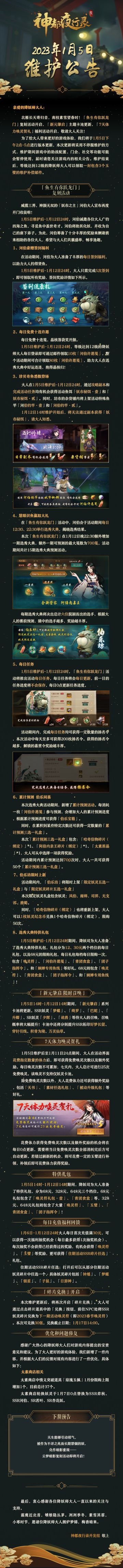 { "text": "#神都夜行录##更新公告##卯兔老板新店开业#\n亲爱的降妖师大人:\n北雁长天寄归音,南枝素雪望春时!「鱼生有你跃龙门」复刻活动开启,「新元肇启」主题卡池更新,「7天体力唤灵贺礼」福利活动开启,敬请大人关注!\n为了给大人带来更好的游戏体验,我们将于1月5日下午2点-5点进行版本更新,本次更新将采用不停服维护的方式,维护期间游戏中的助战配置、门会、社交等功能可能会暂停使用,届时请您关注游戏内的相关公告。维护结束后,等级达到12级的降妖师大人可以领取一封包含3个玉璧的维护补偿邮件。\n\n——下期预告——\n\n天生能够引动邪气,\n被作为不详之兆而长期禁锢的妖,\n化作暗影重现——\n云梦暗影复刻活动即将开启!\n最后,衷心感谢各位降妖师大人一直以来的关注与支持。\n霜鹰近北首,雊雉隐丛茅。冽冽季冬,素雪其霏,小寒时节,愿诸位降妖师大人拥炉梦锦,梅香暗来。\n\n神都夜行录开发组 敬上", "raw_text": "" }