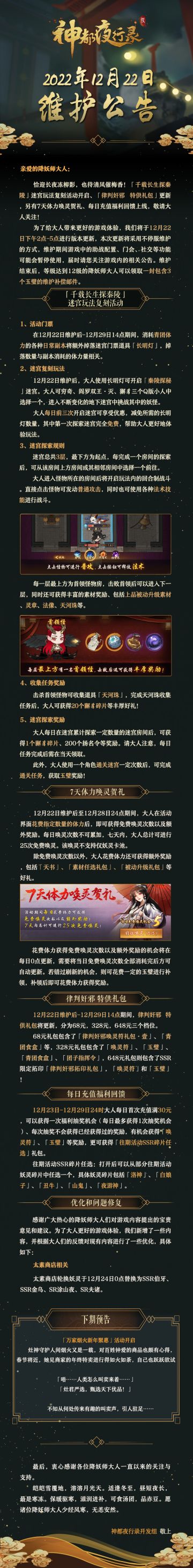 { "text": "#神都夜行录##更新公告#\n亲爱的降妖师大人:\n恰迎长夜冻柳影,也待清风催梅香!「千载长生探秦陵」迷宫玩法复刻活动开启、「律判奸邪 特供礼包」更新,另有7天体力唤灵贺礼、每日充值福利回馈上线,敬请大人关注!\n为了给大人带来更好的游戏体验,我们将于12月22日下午2点-5点进行版本更新,本次更新将采用不停服维护的方式,维护期间游戏中的助战配置、门会、社交等功能可能会暂停使用,届时请您关注游戏内的相关公告。维护结束后,等级达到12级的降妖师大人可以领取一封包含3个玉璧的维护补偿邮件。\n\n——下期预告——\n\n「万家烟火新年聚惠」活动开启\n灶神守护人间烟火又是一载,对百姓钟爱的商品也颇有心得,春节将近,她见商家的年终特卖进行得如火如荼,自己也跃跃欲试。\n「唔……人类怎么叫卖来着……」\n「灶君严选,甄选天下优品!」\n\n不知从何处传来有趣的叫卖声,引人驻足……\n\n最后,衷心感谢各位降妖师大人一直以来的关注与支持。 皑皑雪覆地,溶溶月光天。适逢冬至,昼短夜长,最是寒冻。保暖驱寒,滋润进补,可食汤团,品赤豆。愿诸位降妖师大人少经风寒,无恙安然。\n\n\n神都夜行录开发组 敬上", "raw_text": "" }