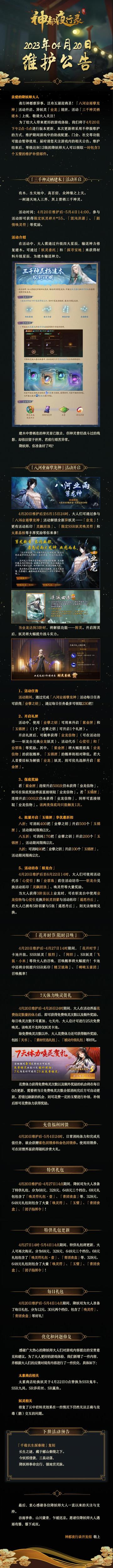 亲爱的降妖师大人: 夜行神都察异事,泛舟五湖迎商圣!「八河业雨孽龙神」活动开启、异妖灵「业龙」现世,活动「三千神灵栖建木」上线,敬请大人关注! 为了给大人带来更好的游戏体验,我们将于4月20日下午2点-5点进行版本更新,本次更新将采用不停服维护的方式,维护期间游戏中的助战配置、门会、社交等功能可能会暂停使用,届时请您关注游戏内的相关公告。维护结束后,等级达到12级的降妖师大人可以领取一封包含3个玉