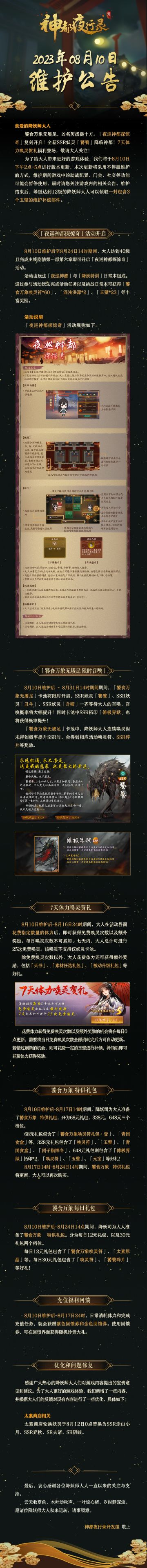 亲爱的降妖师大人: 饕食万象无餍足,凶名厉扬摄十方。「夜巡神都探惊奇」复刻开启!全新SSR妖灵「饕餮」降临神都!7天体力唤灵贺礼福利登场,敬请大人关注! 为了给大人带来更好的游戏体验,我们将于8月10日下午2点-5点进行版本更新,本次更新将采用不停服维护的方式,维护期间游戏中的助战配置、门会、社交等功能可能会暂停使用,届时请您关注游戏内的相关公告。维护结束后,等级达到12级的降妖师大人可以领取一封