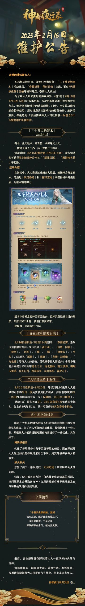 #神都夜行录# #卯兔老板新店开业##吉兔驰跃贺嘉年##更新公告# 亲爱的降妖师大人: 东风解冻散为雨,渌波归水獭祭鱼!「三千神灵栖建木」活动开启,「春霖初霁 限时召唤」上线,更有7天登录免费十五抽等福利开启,敬请大人关注! 为了给大人带来更好的游戏体验,我们将于2月16日下午2点-5点进行版本更新,本次更新将采用不停服维护的方式,维护期间游戏中的助战配置、门会、社交等功能可能会暂停使用,届时请您