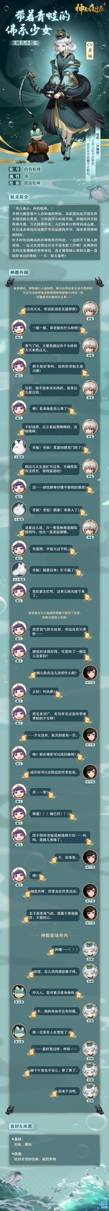 #神都夜行录##卯兔老板新店开业##吉兔驰跃贺嘉年##新妖灵情报# 临近春节,婉儿在卯兔商行接到了一份特殊的委托。可是千雪小姐姐却告诉婉儿她在附近的井里… 井…里?该不会婉儿来晚了吧… 降妖师大人快和婉儿一起去看看吧!