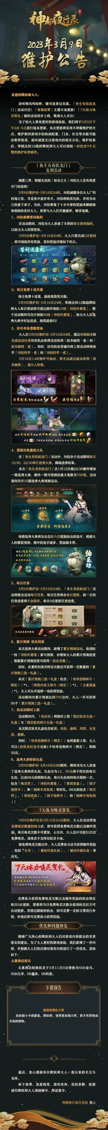 #神都夜行录##更新公告##神都春日家园# 亲爱的降妖师大人: 卧听柳风鸣枕畔,赌书泼茶过双溪。「鱼生有你跃龙门」活动开启!「春霖初霁」主题卡池更新!「7天体力唤灵贺礼」福利活动同步上线,敬请大人关注! 为了给大人带来更好的游戏体验,我们将于3月9日下午2点-5点进行版本更新,本次更新将采用不停服维护的方式,维护期间游戏中的助战配置、门会、社交等功能可能会暂停使用,届时请您关注游戏内的相关公告。维