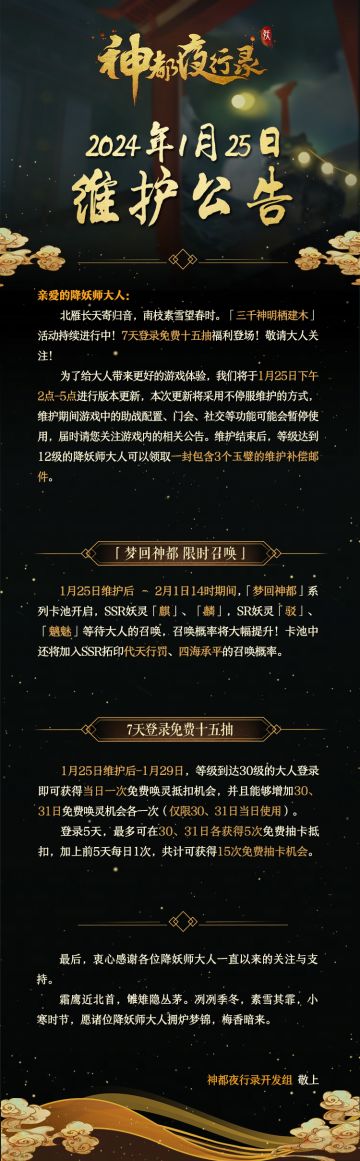 亲爱的降妖师大人: 北雁长天寄归音,南枝素雪望春时。「三千神明栖建木」活动持续进行中!7天登录免费十五抽福利登场,敬请大人关注! 为了给大人带来更好的游戏体验,我们将于1月25日下午2点-5点进行版本更新,本次更新将采用不停服维护的方式,维护期间游戏中的助战配置、门会、社交等功能可能会暂停使用,届时请您关注游戏内的相关公告。维护结束后,等级达到12级的降妖师大人可以领取一封包含3个玉璧的维护补偿邮