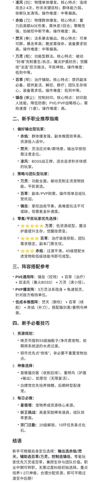 来个新手入坑职业选择指南