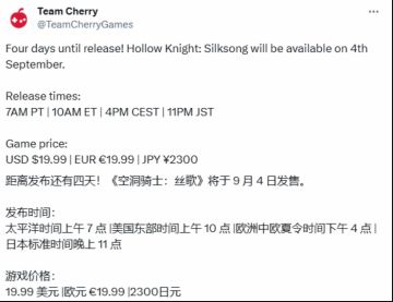 《空洞骑士:丝之歌》9.4发售,价格亲民