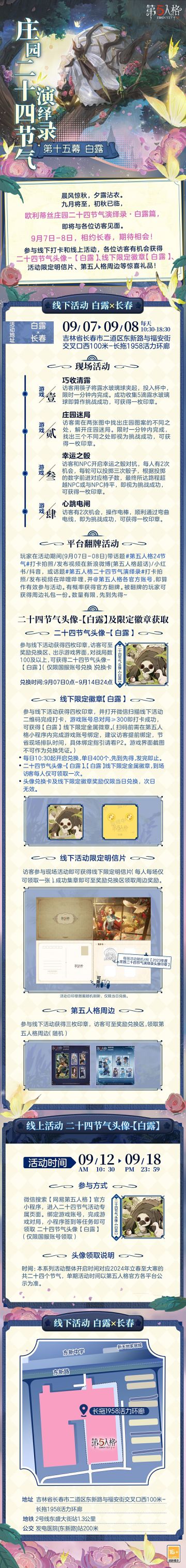 9月金秋将至,寒生露凝, 欧利蒂丝庄园二十四节气演绎录·白露篇, 与渐凉的时节一起,走进长春。 9月7日-8日,期待与各位访客相会! —————————— 【线下活动】白露·长春 活动时间:9月7日-8日 每日10:30-18:30 活动地点:吉林省长春市二道区东新路与福安街交叉口西100米-长拖1958活力环廊 参与现场活动,各位访客有机会获得二十四节气头像-【白露】兑换卡、线下限量徽