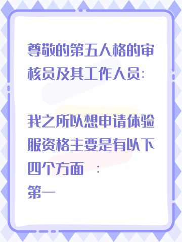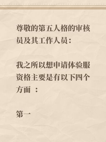 尊敬的第五人格的审核员及其工作人员: 我之所以想申请体验服资格主要是有以下四个方面 : 第一,我想体验新地图新玩法新角色 如果有什么问题一定会第一时间反馈给官方 第二,我十分热爱第五人格 ,从开服以来到现在,依然热爱 第三,觉得《第五人格》这款游戏 制作很精美,如果提前体验新改动礼包然后好说下这些感受和不足然后改进让玩家有更好的游戏 如果有幸能参加第五人格共研服,我将积极表达自己的看法并