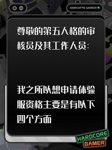 尊敬的第五人格的审核员及其工作人员: 我之所以想申请体验服资格主要是有以下四个方面 : 第一,我想体验新地图新玩法新角色 如果有什么问题一定会第一时间反馈给官方 第二,我十分热爱第五人格 ,从开服以来到现在,依然热爱 第三,觉得《第五人格》这款游戏 制作很精美,如果提前体验新改动礼包然后好说下这些感受和不足然后改进让玩家有更好的游戏 如果有幸能参加第五人格共研服,我将积极表达自己的看法并