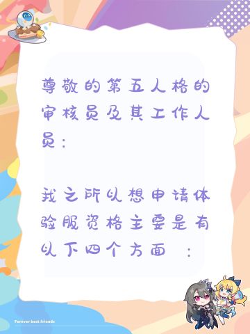 尊敬的第五人格的审核员及其工作人员: 我之所以想申请体验服资格主要是有以下四个方面 : 一我想体验新地图新玩法新角色 如果有什么问题一定会第一时间反馈给官方 二我十分热爱第五人格 ,从开服以来到现在,依然热爱 三觉得《第五人格》这款游戏 制作很精美,如果提前体验新改动礼包然后好说下这些感受和不足然后改进让玩家有更好的游戏 如果有幸能参加第五人格共研服,我将积极表达自己的看法并为这个游戏变