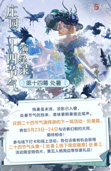 秋季的第二个节气即将来到,暑气退伏潜藏,以待来年, 在这暑热将薄之时,欧利蒂丝庄园二十四节气演绎录· 处暑篇将与各位访客开启秋日的约定, 8月23日-24日,大同相会~ 一、线下活动:处暑·大同 活动时间:2025年8月23日-24日 每日10:30-18:30 地址: 山西省大同市云冈区吾悦广场3号门1F大中庭 【线下限定徽章活动】 庄园二十四节气演绎录·处暑活动的线下徽章获取采取报