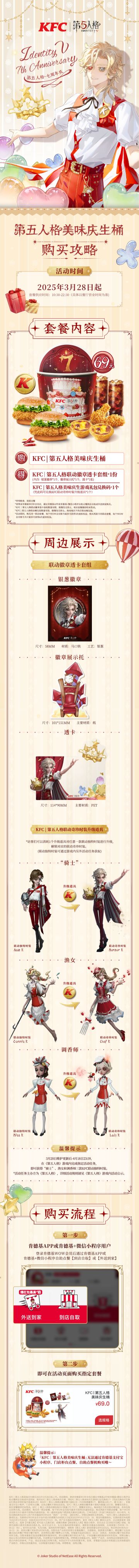 第五人格×肯德基 联动第三弹,美味庆生活动即将开启! * 3月20日-4月18日活动期间,完成游戏任务,可得三款联动独特时装; * 3月28日起,买指定联动套餐,获取联动奇珍升级道具、联动头像及定制周边; * 2款特别庆生美味、全国400+限时主题店,线下打卡活动即将开启; * 温馨提示:消耗1个升级道具可对任意1款联动独特时装进行升级,解锁对应的联动奇珍时装。 具体活动情报,已为访客们