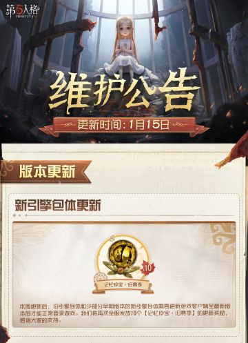 2026年1月15日维护公告划重点版本送达~ 冰雪节活动正式开启! 本周维护更新后,我们将再次全服发放10个【记忆珍宝·旧赛季】的新引擎更新奖励,感谢大家的支持! #第五人格维护公告