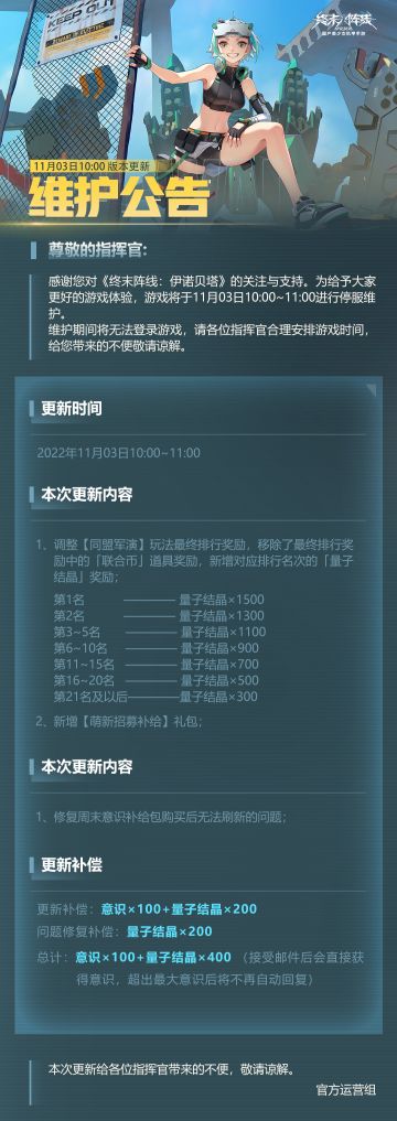 { "text": "尊敬的指挥官:\n感谢您对《终末阵线:伊诺贝塔》的关注与支持。为给予大家更好的游戏体验,游戏将于11月03日10:00~11:00进行停服维护。\n维护期间将无法登录游戏,请各位指挥官合理安排游戏时间,给您带来的不便敬请谅解。", "raw_text": "" }