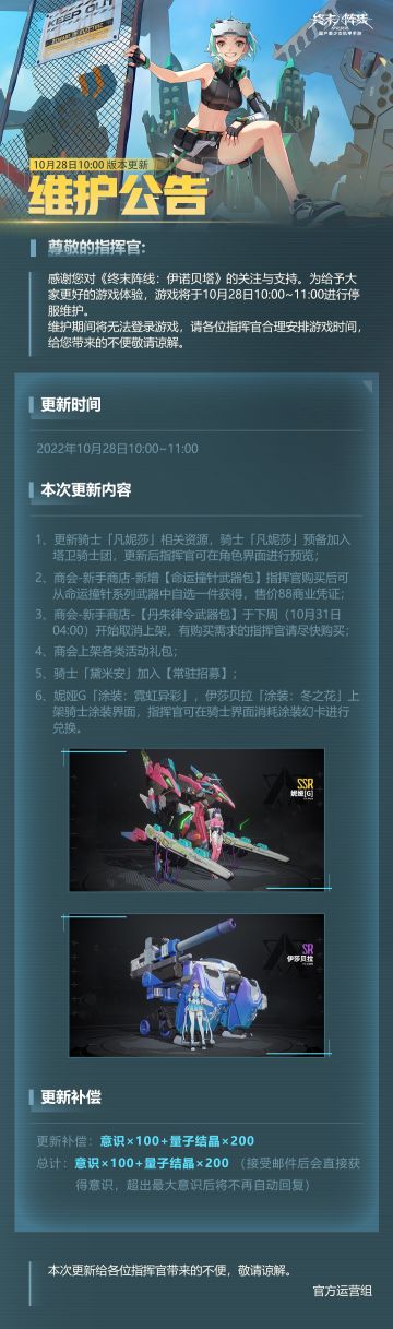 { "text": "尊敬的指挥官:\n感谢您对《终末阵线:伊诺贝塔》的关注与支持。为给予大家更好的游戏体验,游戏将于10月28日10:00~11:00进行停服维护。\n维护期间将无法登录游戏,请各位指挥官合理安排游戏时间,给您带来的不便敬请谅解。", "raw_text": "" }