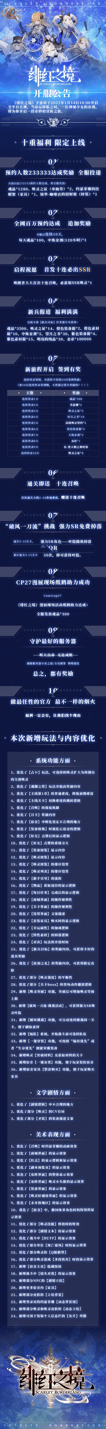 { "text": "嘤~(塔塔酱探头)\n\n距《绯红之境》公测还有3天!!!!\n\n令人期待的公测倒计时火热进行中\n\n先公布欧皇名单:\n殇灬影月\n可爱酱的呐!\n\n还有三天\n\n塔塔酱就可以和大家见面啦!\n\n今天先带来公测福利情报!\n\n相信这就是唤醒者大大们最关心的东西\n\n话不多说\n\n一起来康康吧!\n\n七重福利 限定上线\n\n预约人数233333达成奖励 全服投递\n\n庆祝B站233333预约人数达成,将全服发放:\n\n魂晶*1280、唤灵之证(单抽券)*2、约瑟菲娜的挂帽架(家具)*1、绫华-咖啡店的招财娘(时装)*1\n\n全网百万预约达成 追加奖励\n\n开服后连续10天,每天魂晶*100,中炼金剂(120小时)*1\n\n启程祝愿 首发十连必出SSR\n\n唤醒者大大首次十连召唤,必获取SSR唤灵*1\n\n新兵报道 福利满满\n\n完成全部【新兵目标】任务累计可获得:\n\n魂晶*3500、唤灵之证*14、橙色装备箱*2、橙色素材箱*10、中炼金剂*5、望月之书*30、紫色装备箱*4、紫色素材箱*15、明亮的纯晶*30、金币*10000。\n\n新旅程开启 签到有奖\n\n连续登录签到,可获得丰厚的10日签到奖励:(要10日连续登录签到哦,不然就会错失奖励的!!!)\n\n“破风一刀流”挑战 强力SR免费掉落\n\n通关3-15关卡,强力SR角色——叶隐随机掉落or累计通关3-15关卡50次,即可获得叶隐。\n\nCP27漫展现场纸鹤助力\n\nComicup27《绯红之境》漫展现场纸鹤助力活动:全服发放魂晶*300\n\n还有3天\n\n《绯红之境》即将开启全平台公测,\n全体上下良心运营,\n已为玩家们准备大量超值福利,\n开启更多游戏玩法,\n优化游戏系统,\n只为给玩家提供优质的沉浸式体验。\n更多游戏相关情报已准备完毕,\n每日都会有新惊喜,\n唤醒者大大们敬请期待吧!\n求你了~\n\n倒计时留言福利\n第二天的福利如约而至\n关注TapTap《绯红之境》官方账号\n在每日倒计时专栏贴下\n留言!!!\n然后\n活动规则:在当日倒计时下留言!\n随机抽取2位欧皇大大!\n欧皇:将在第二日的倒计时贴下公布!\n奖品发放时间:1月14日公测后7个工作日内!\n塔塔酱会来私信敲欧皇哦!!!\n", "raw_text": "" }
