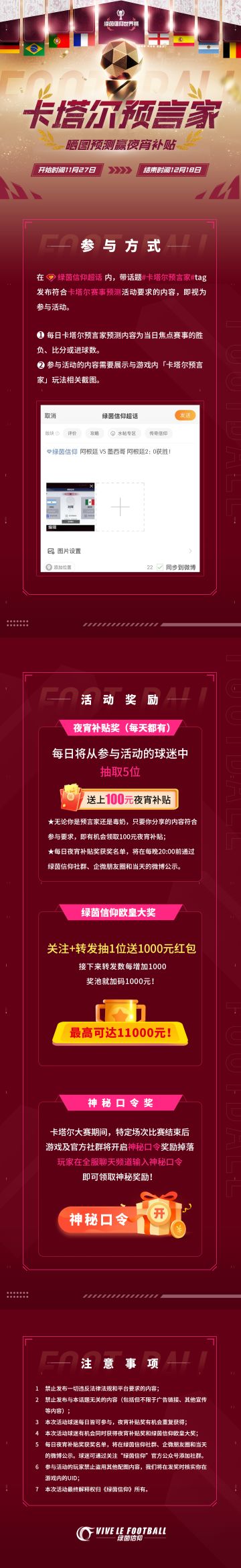 "text": "☆#卡塔尔预言家# 晒图预测征集活动开启☆\n看球聊球来绿茵,每日百元夜宵补贴、绿茵信仰欧皇大奖、神秘口令,等你来领!欢迎各位球迷前来分享参与~\n\n◆活动时间:11月27日-12月18日\n◆参与方式:在#绿茵信仰[超话]# 内,带话题#卡塔尔预言家# tag发布符合卡塔尔赛事预测活动要求的内容,即视为参与活动。\n1.每日卡塔尔预言家预测内容为当日焦点赛事的胜负、比分或进球数;\n2.参与活动的内容需要展示与游戏内「卡塔尔预言家」玩法相关截图;\n\n*点击下方长图,查看活动更多详情↓↓↓\n☆关注+转发官方指定微博内容,抽1位送1000元红包,接下来转发数每增加1000,奖池就加码1000元,最高可达11000元!微博指路:https://weibo.com/7513094827/MgYuuEZJb\n不留遗憾,共赴四年之约。《绿茵信仰》决胜卡塔尔全新版本现已开启!魔兽德罗巴倾情代言,带你感受不滚卡的足球赛场体验。",